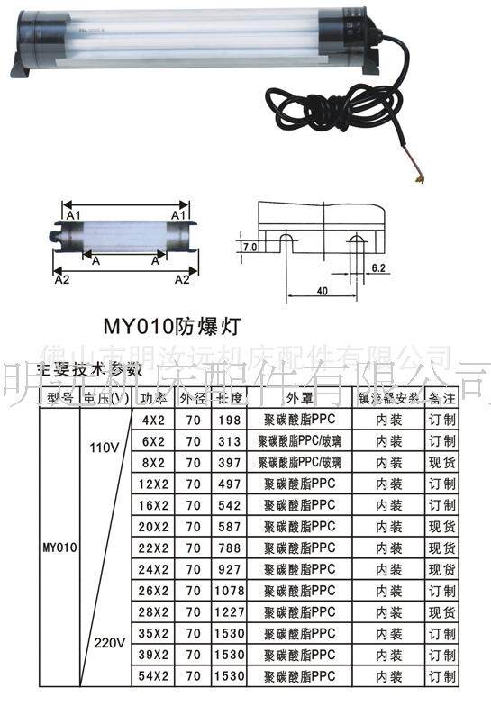 MY010防爆灯,本产品采用新光源荧光灯泡,光线柔和,聚光性能好,适用于各中、小型机床,数控机床,组合机床及其它设备的照明,并具有防水、防爆、防侵蚀等优点。分别有电压:110V/220V 功率:4W、6W、8W、12W、16W、20W、22W、24W、26W、28W 长度由功率而定