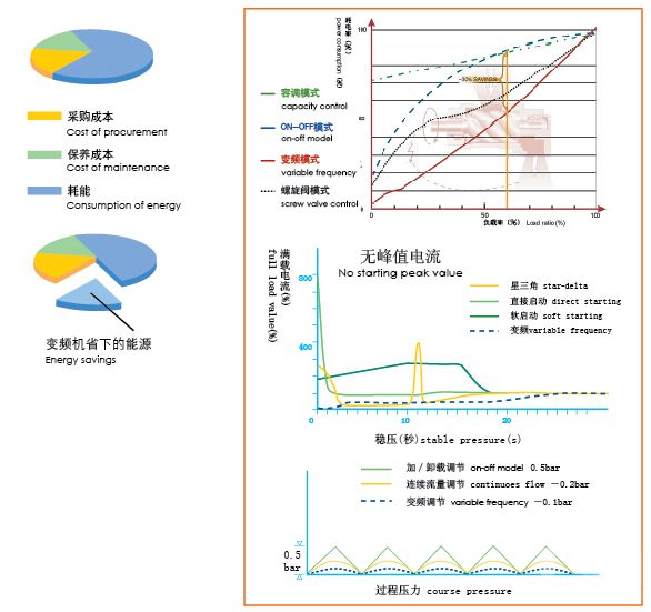 1) 节能: 根据用气量进行自动调节,与传统的负载/空转的控制模式比较,变频控制可节约运行成本53%。平均投资回报期为一年。