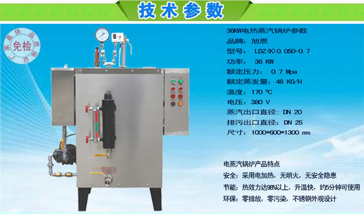 4. 灵活便捷:采用符合JB/2379-93和《金属管状电加热元件技术条件》要求的低表面热负荷电热元件;优质电热丝外套加厚不锈钢管,内置进口昂贵镍硌合金电热元件,热效率高,寿命更长。每组电热元件采用加大法兰连接,控制系统采用多组电热管分组控制,可根据用汽量灵活开启用电功率。5. 安全:整机严格按照《蒸汽锅炉安全技术监察规程》制造,保证用户拥有放心可靠的产品。具备齐全的多项保护功能,漏电保护、缺水保护、接地保护、蒸汽超压保护等,锅炉自动保护。