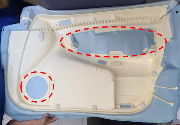 车门内饰板的结构是表面材料、中间层材料、及芯材组成,形成是将中间层材料(聚乙烯泡沫)粘合到芯材(塑料)上,然后粘合表面材料(皮革货化学纤维)。扬声器装置和内门锁把手处的孔,就需要进行用高速电主轴进行铣削了。下面来看下铣削孔的概况: