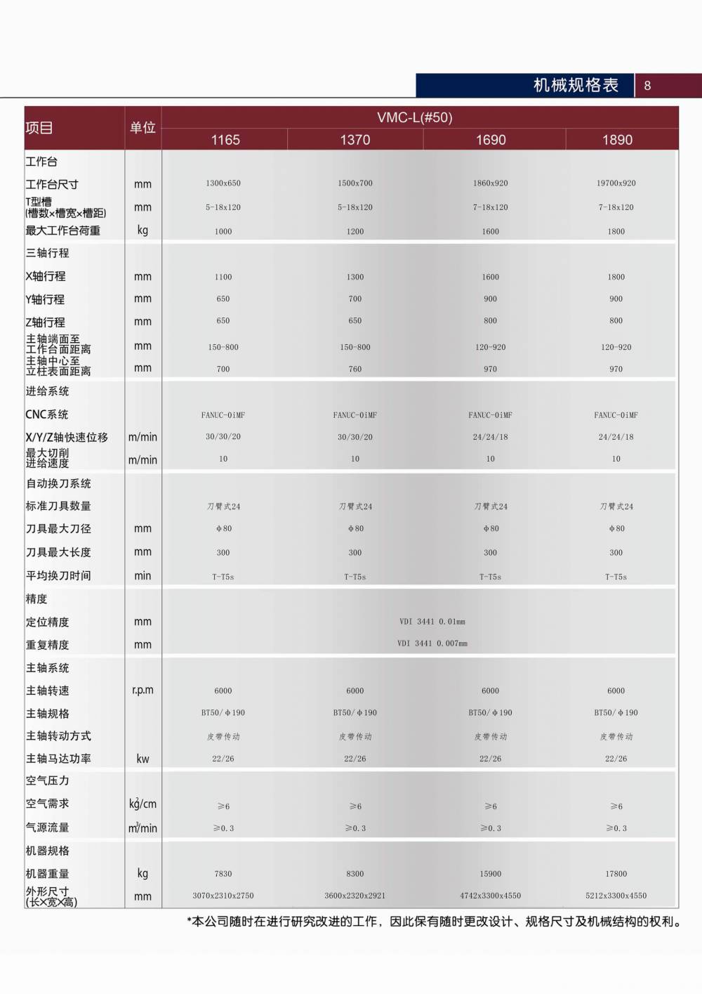 ※ 主轴转速:皮带驱动:1165/1370/1690/1890VMC 6000rpm;齿轮驱动:1370/1690/1890VMC 6000rpm