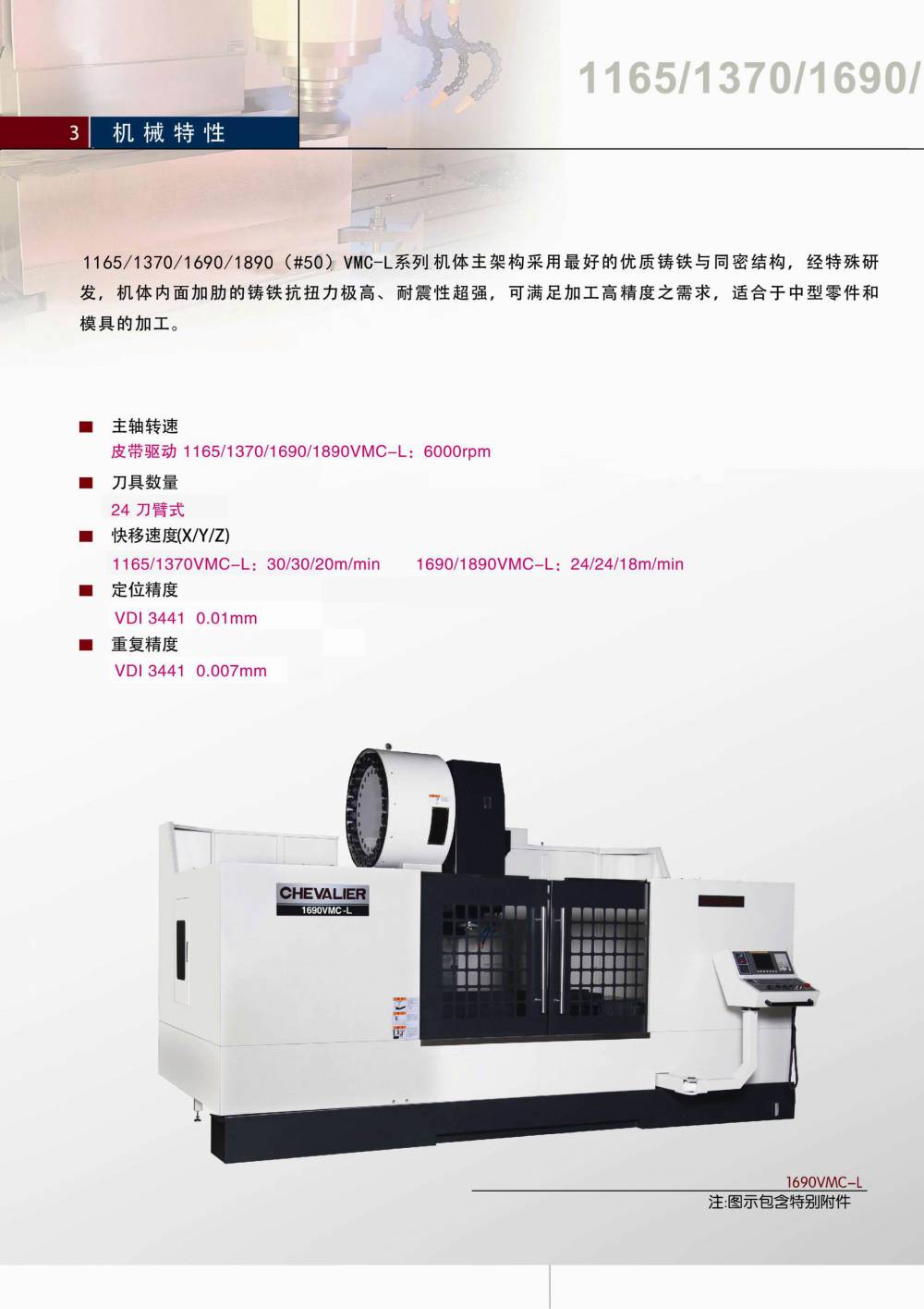 本系列1165/1370/1690/1890(#50)VMC机体主架构采用铸铁与同密结构,经特殊研发,机体内面加肋的铸铁抗扭力极高,耐震性超强,可满足加工高精度之需求,适合于中型零件和模具的加工。