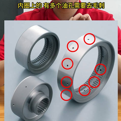 今天来讲讲一个内孔去毛刺案例,先来看看工件毛刺情况,内圈上的 有多个油孔需要去毛刺,内圈内部的毛刺需深入进去倒C0.3mm倒角,常规的直柄主轴就没办法加工,所以可以使用NAKANISHI直角主轴RA-200,主轴头部深入长度28.5mm,进去内孔进行倒角是没有问题的,其直径22.8mm,内含减速比1/1.5,输出转速是13330转/min,配上减速机,倒C0.3mm角是可以的,若是对主轴外形长度有限制的,使用直角主轴就可以解决此问题。