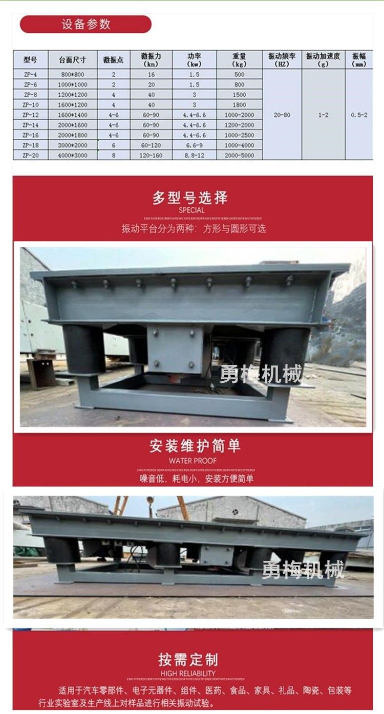 小型试验台 低频振动平台振动平台在使用过程中,可以通过调节振动电机激振力大小,来使平台上物料实现理想的形式。ZDP系列振动平台结构简单。运行可靠、重量轻、体积小、安装简便。振动平台又叫振实台,主要用于物料的震实,减少物料内的空气和缝隙,一般和料仓配套使用。振实台在生产流程中用于把颗粒、粉状物料从散装变为块状或其他形状等形式上的转变。