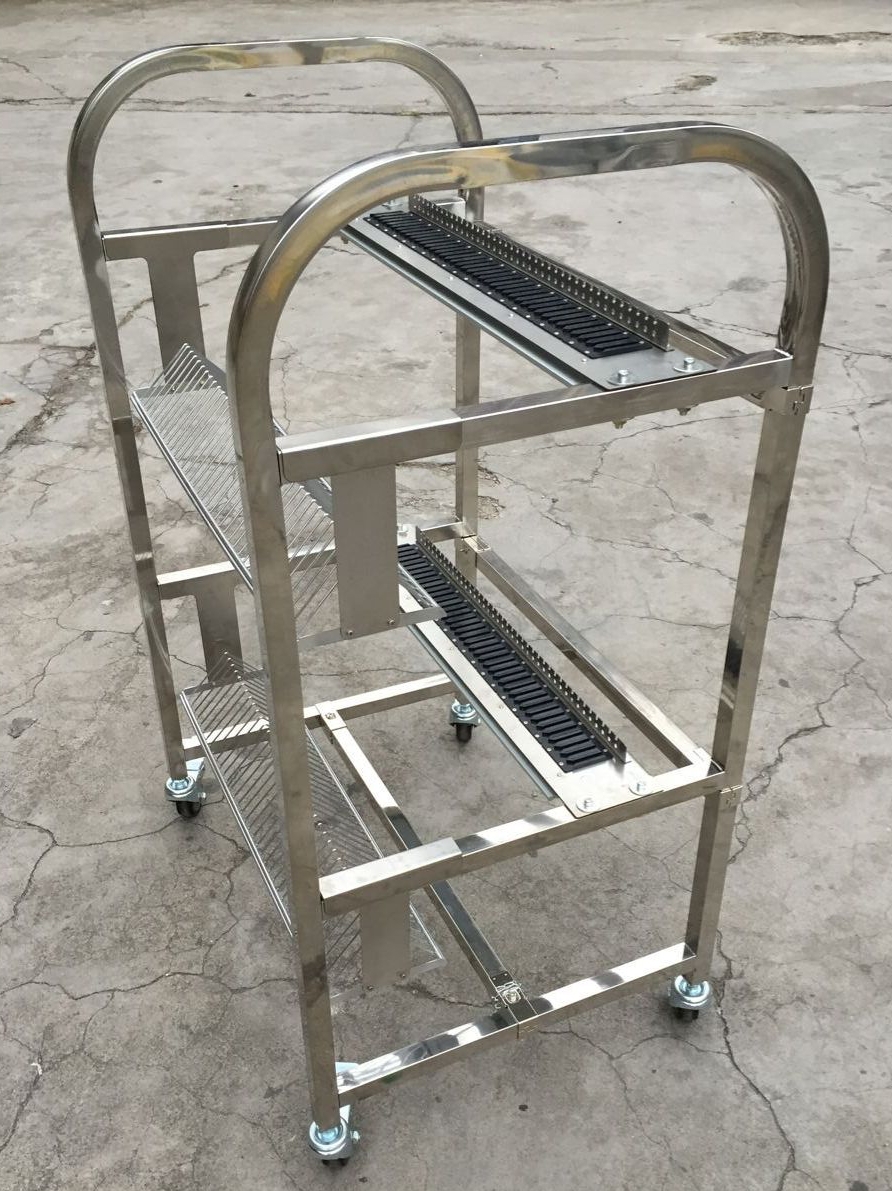 飞达车特点:飞达车采用不锈钢材料加工而成,车身牢固、轻便,耐用,灵活,整体飞达放置平台均采用手工焊接工艺,安装防静电拖链,可随意移动、带刹车装置。分上下两层、共可装载80只飞达。广泛应用于SMT生产车间FEEDER的周转及放置,安放平稳,取放自由,大大增加了工作生产效率。均采用不锈钢和铝型制作。